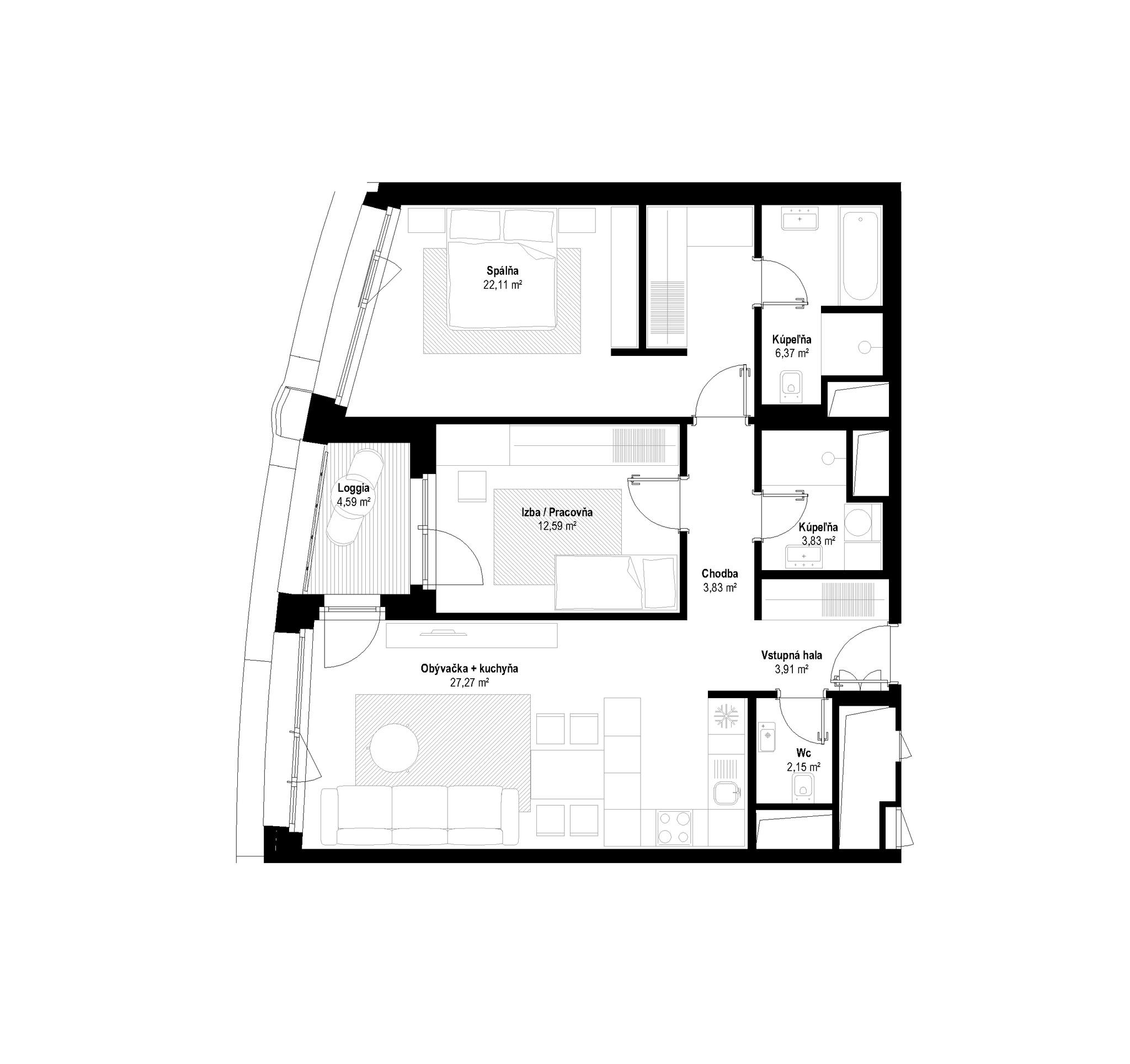 Uvedené rozmery a plochy jednotlivých miestností sú predbežné a môžu vykazovať odchýlky. Umiestnenie zariaďovacích predmetov je len ilustračné.